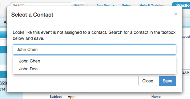 Now, with one click, you are able to easily create a SOAP Note for your patients. If the appointment has not yet been associated with a contact record, you are presented with a popup to select a patient.