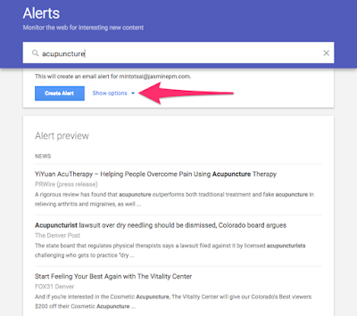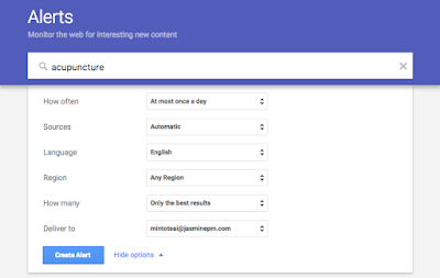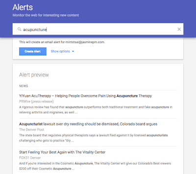 In the search box, type in the keyword you would like to create an alert for like your practice name or the keyword “acupuncture”.